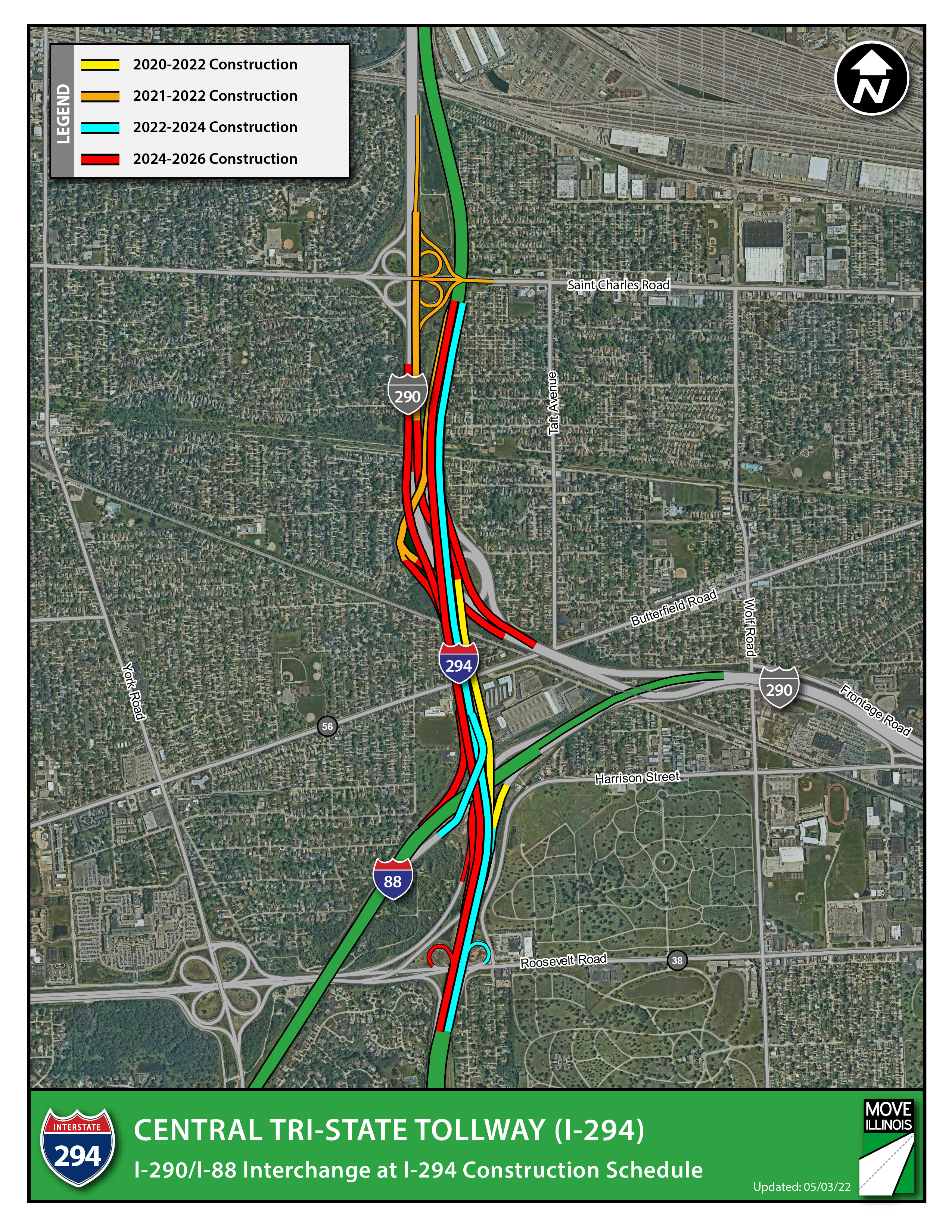 The reconfiguration and reconstruction of the I-290/I-88 Interchange is estimated at $700-$800 million and will reduce congestion, improve safety and address operational issues, as well as infrastructure conditions as part of the Illinois Tollway’s Central Tri-State Project. Work started in 2020 and is scheduled to be complete by the end of 2026.
