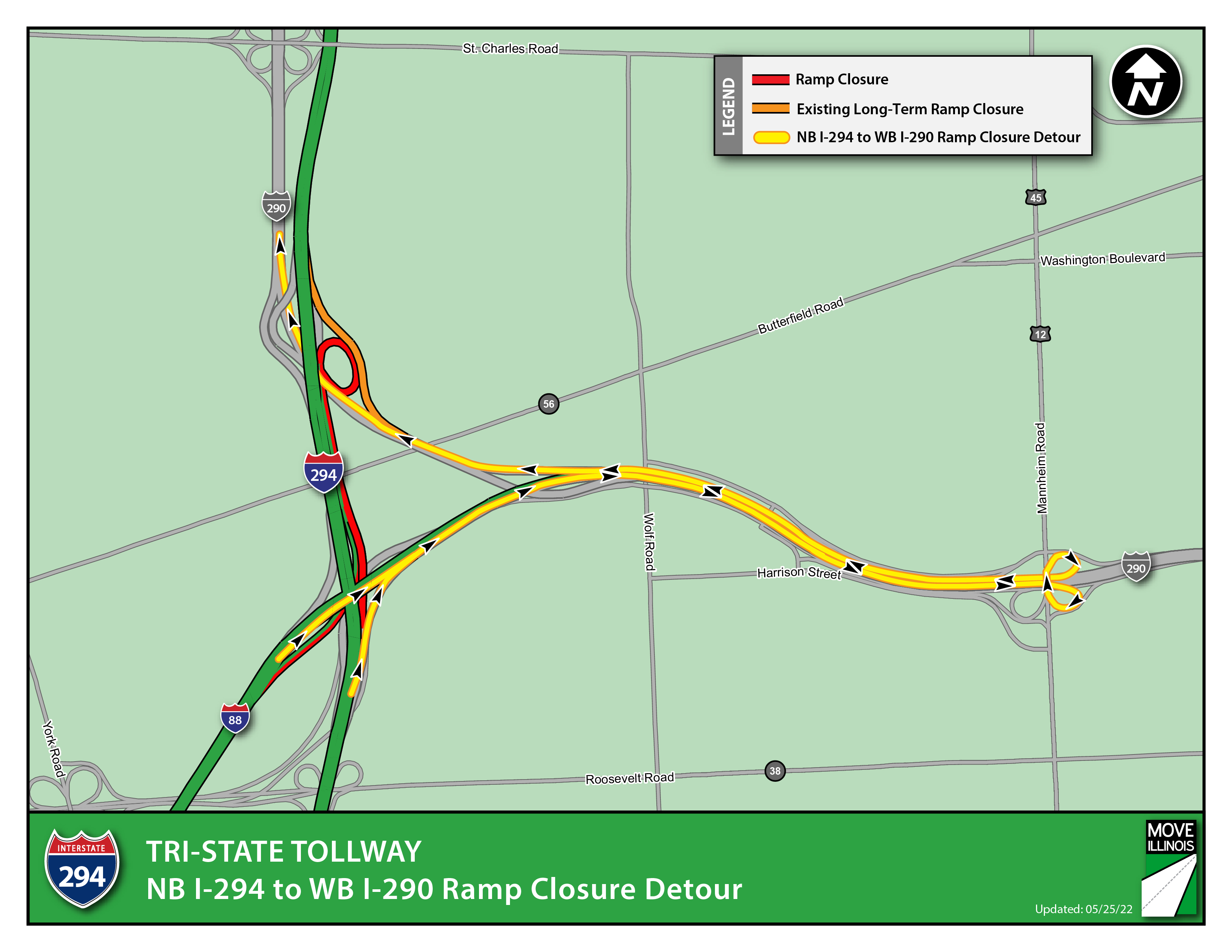 The ramp carrying traffic from westbound I-290 to northbound I-294 is closed. A detour is posted. The ramp is scheduled to remain closed through the end of 2024.